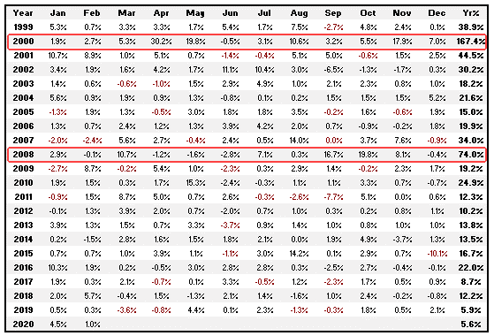 The following monthly return breakdown shows that even though this is a ‘long only’ strategy, major down years have been quite profitable. 2000 and 2008 both showed solid returns even though the broader market fell sharply.