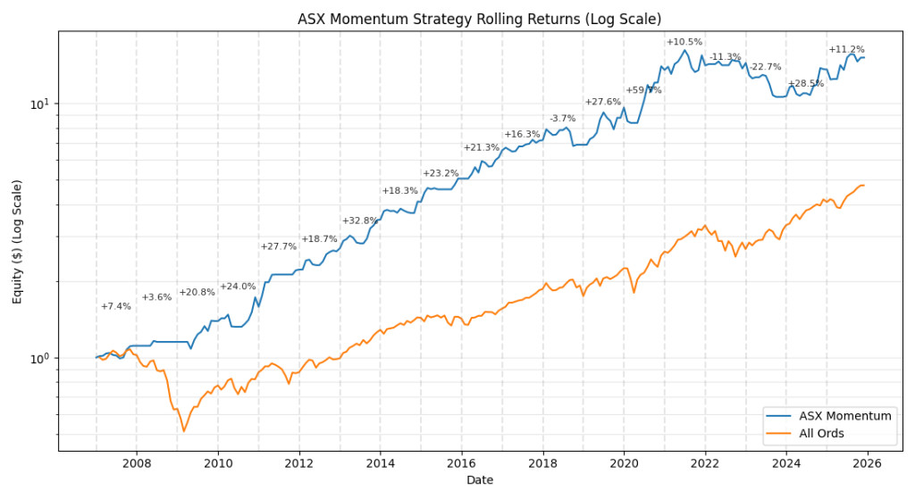 The ASX Momentum is a low-effort, high-growth systematic strategy trading the large cap ASX-100 just once a month.