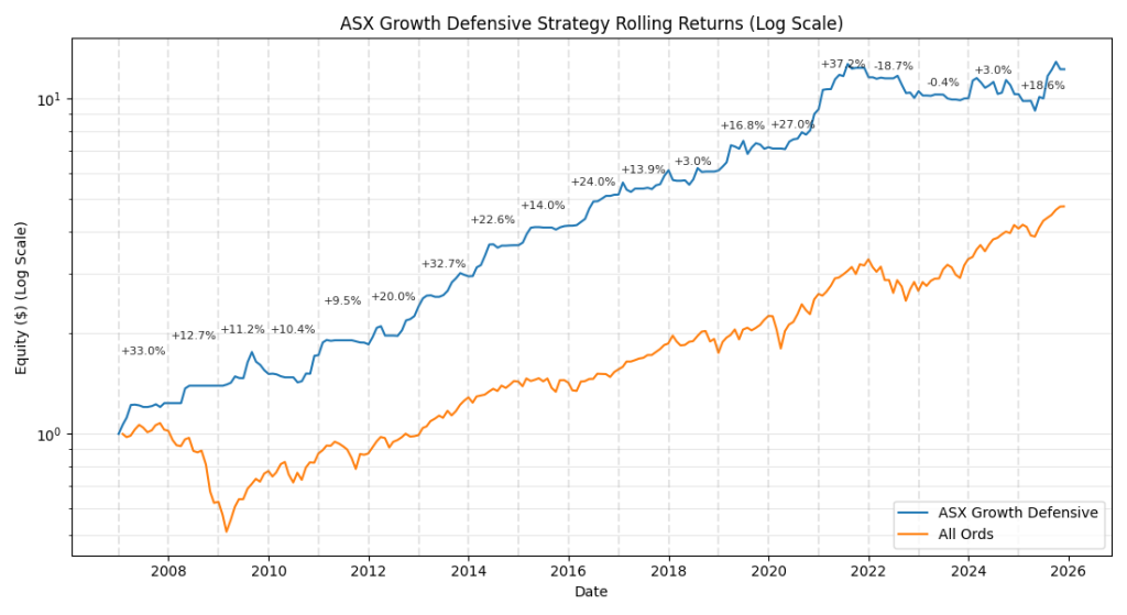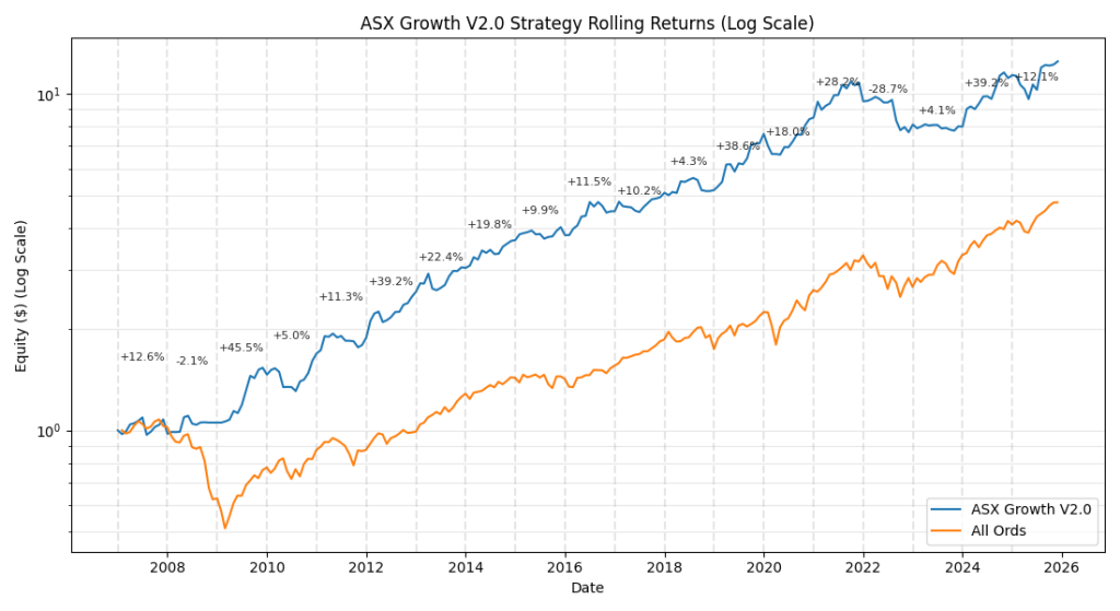 The Growth Portfolio is a fully systematic long-term trend following strategy for the ASX.