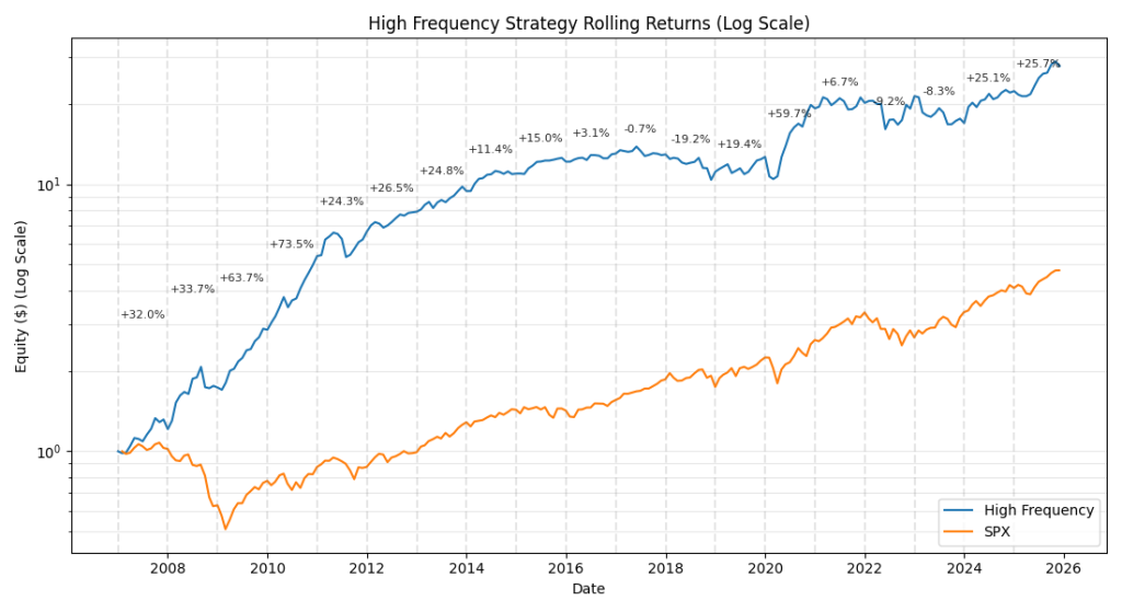 The US High Frequency is a fully systematic mean reversion strategy trading up to 20 positions daily. For advanced traders only.