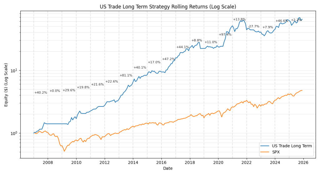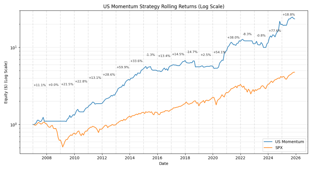 The US Momentum is a low-effort, high-growth systematic strategy trading the Russell-1000 just once a month.