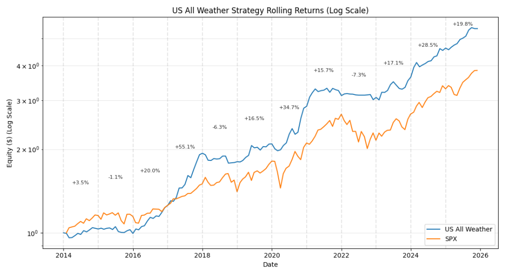 The US All Weather is a low-effort, low-volatility strategy offering minimal drawdowns and diversification through ETFs.