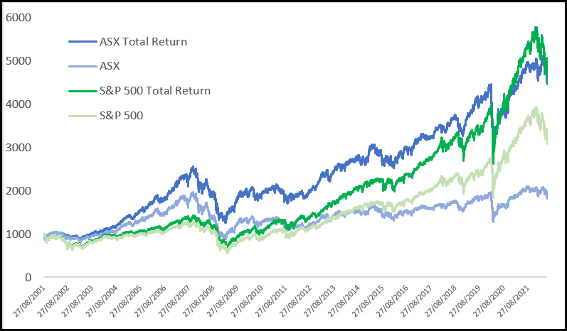 However, Australia is quite unique in that investors demand large dividends. When dividends are stripped out we get the light blue line, or the base index return. When dividends are included, known as the total return index, we get the dark blue line.