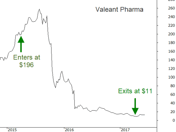 Knowing the point that the analysis is invalidated is an important element of successful trading – and tends to be easier with technicals than fundamentals. The following chart of Valeant Pharmaceuticals is a great example. Bill Ackman, billionaire hedge fund manager, took a $2.5b position in 2015 at an average price of $196. He exited in early 2017 at $11 after conceding that management were unable to turn the company around.