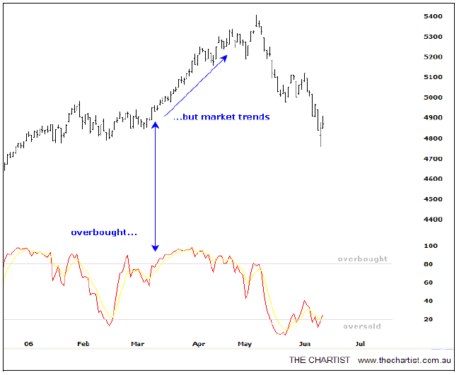 The following chart shows the Stochastic overlaid on the XJO. The indicator is classified as an ‘overbought/oversold’ indicator which means that when it stretched to the upper or lower boundaries the market should reverse. You can see a prime example of where the indicator hits the upper boundary but the market trends powerfully higher. This is where most people come unstuck!